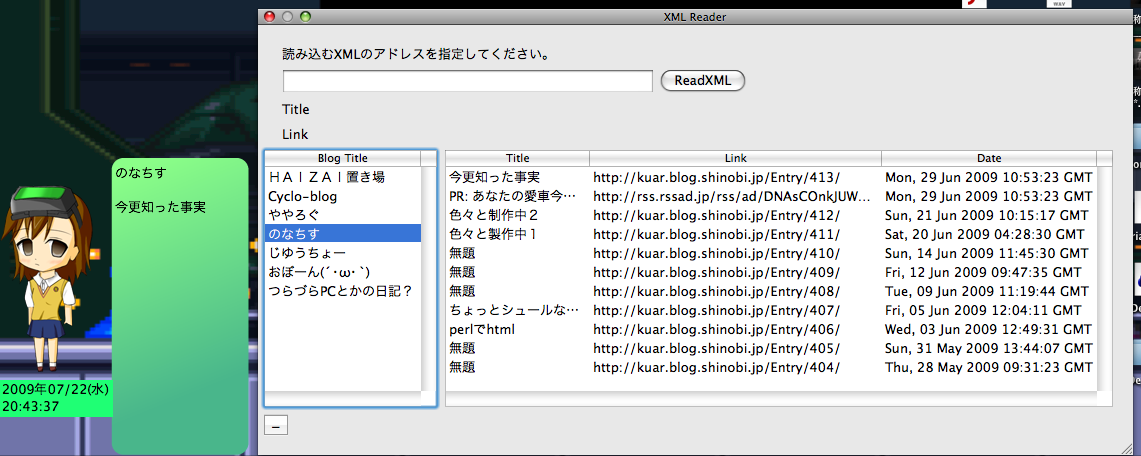最初はかなりとっつきにくくて分かりにくかったのだが慣れてくると半端なく見やすい。 -(void)output{ NSString* str; str = @"Hallo word"; [textField setStringValue:str]; } 多分こんな感じ。 [変数名 メソッド:引数]; textFieldはまあ NSTextField* testField; といったところ。 JavaあたりでいうLabelか。GUIとの連携がかなり奇特でoutletの接続とかをやらなきゃいけないのだが慣れると便利。 結局作るものは毎度おなじみで今回はRSSを読み出し一定時間ごとに表示させる。 ついでに右クリックからRSSReaderWindowを表示させて必要な情報を得られるようにした。 Objective-cは標準でRSSを読み込む為の型とか用意してくれているのでサンプルコードを抜き取ってこればわりと簡単に出来た。 ただRSSからXPathで記事情報まるまるとってきているので広告とかもまぎれてくる。 しょうがないといえばしょうがないけどエラー処理としては読み込み先のアドレスくらいわかってるんだからそのアドレスと全く関係ないようなアドレスは無視させるようにすれば一応広告だけ無視することもまあ、可能といえば可能だが。 ただ透明のウィンドウなのだがただ透明なだけで当たり判定というかクリック判定とか諸々のこっているのはやめてほしい。 |
